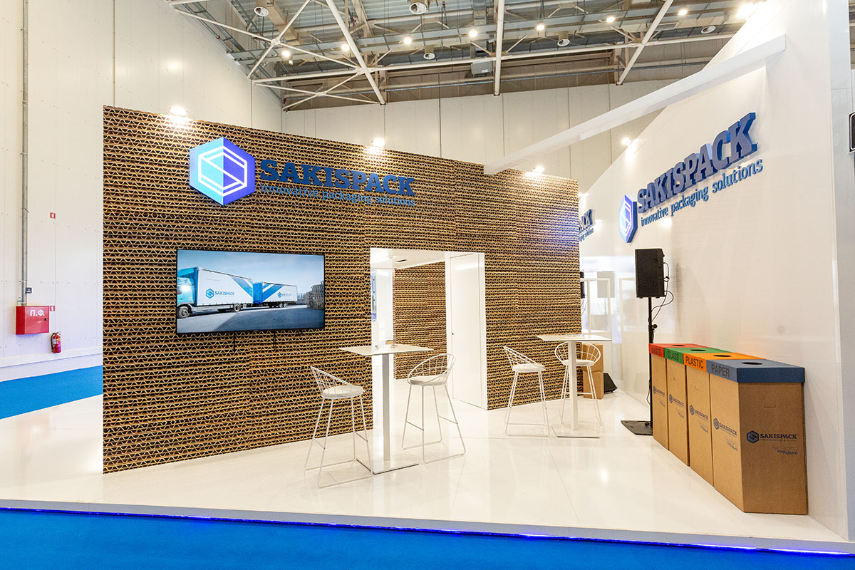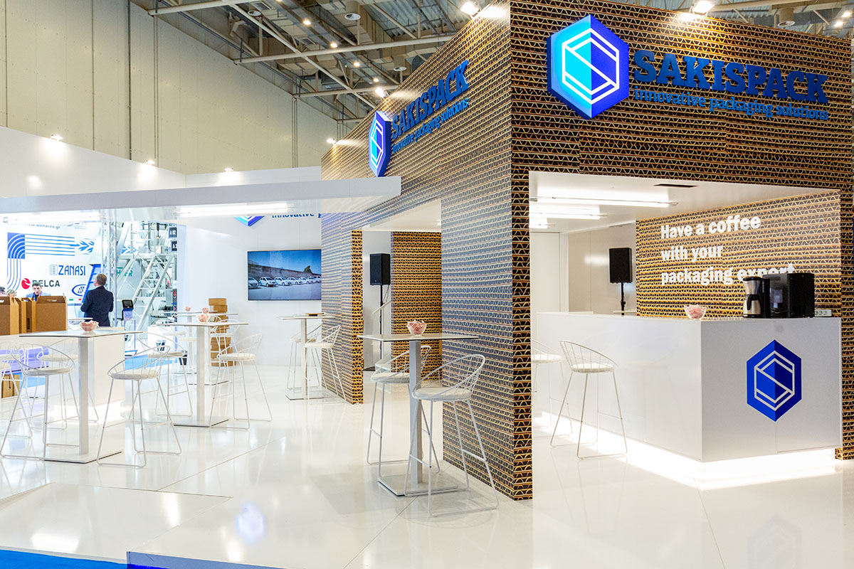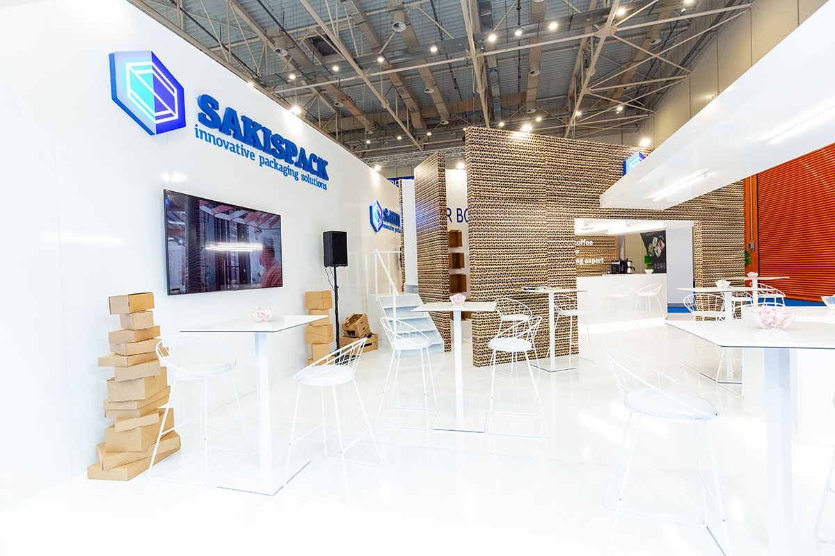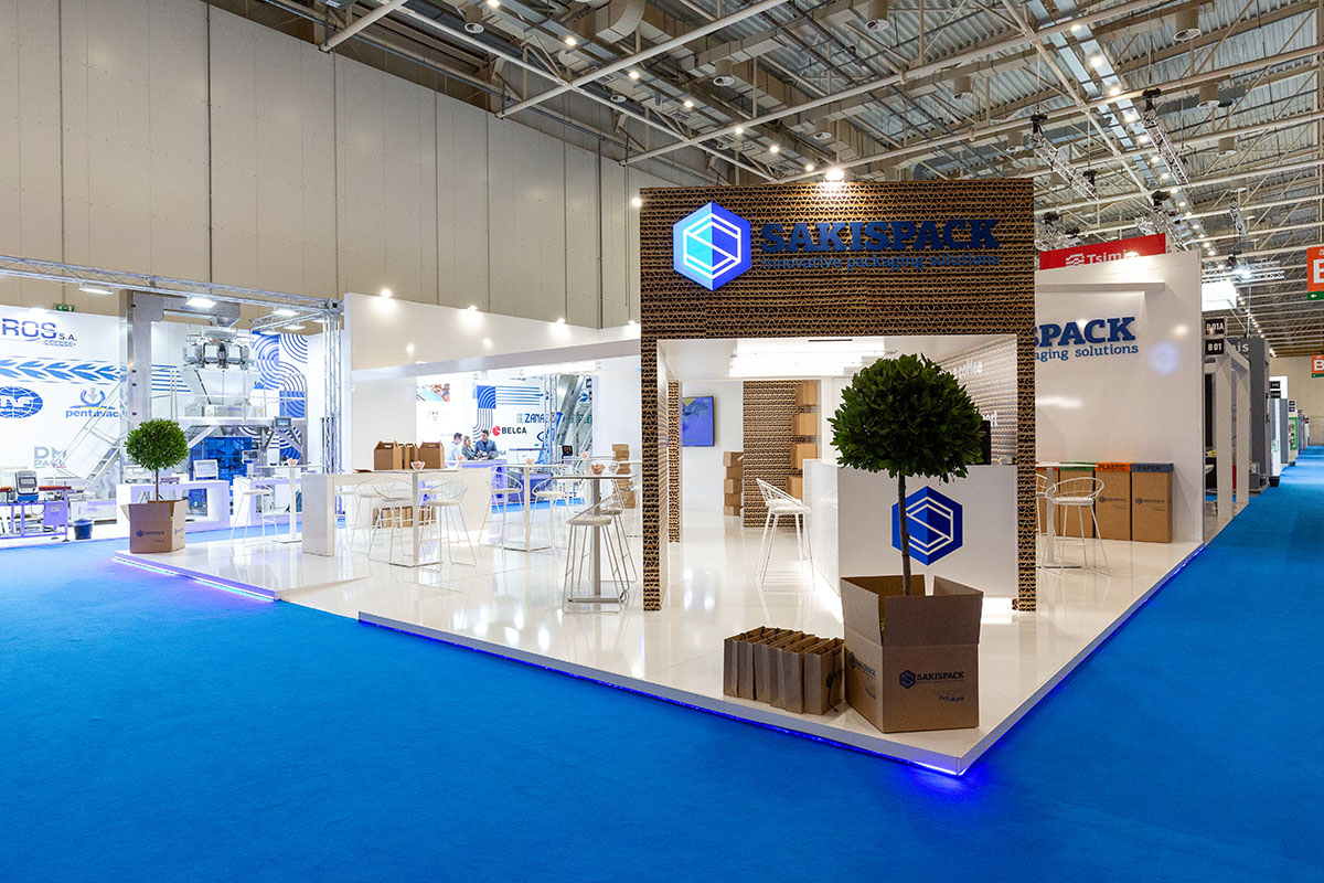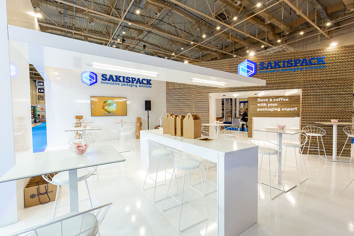 Μελέτη και κατασκευή διώροφου περιπτέρου για την συμμετοχή της εταιρείας Sakispack στην Έκθεση Food tech Globalpack 2023, στον εκθεσιακό χώρο Metropolitan Expo.